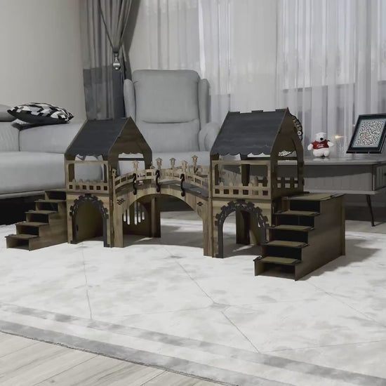 Two-Story Bunny Castle with Suspension Bridge: Modern Wooden Rabbit House